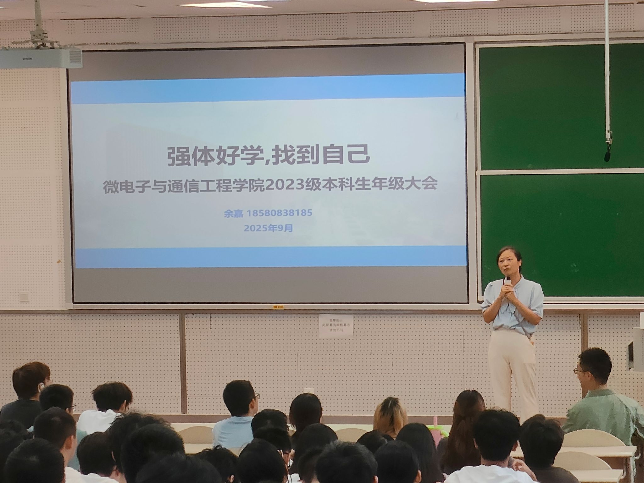 2025年9月25日下午13:00,重庆大学微电子与通信工程学院在虎溪校区第一教学楼D1137顺利召开2023级本科生年级大会。本次会议由2023级辅导员林瑞敏老师主持,学院党委副书记余嘉出席并作重要讲话。