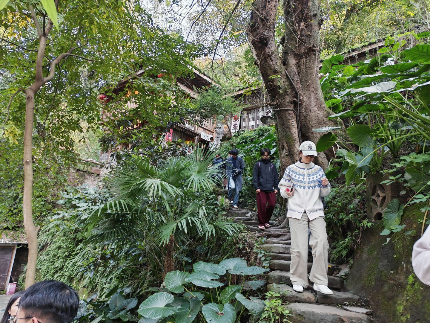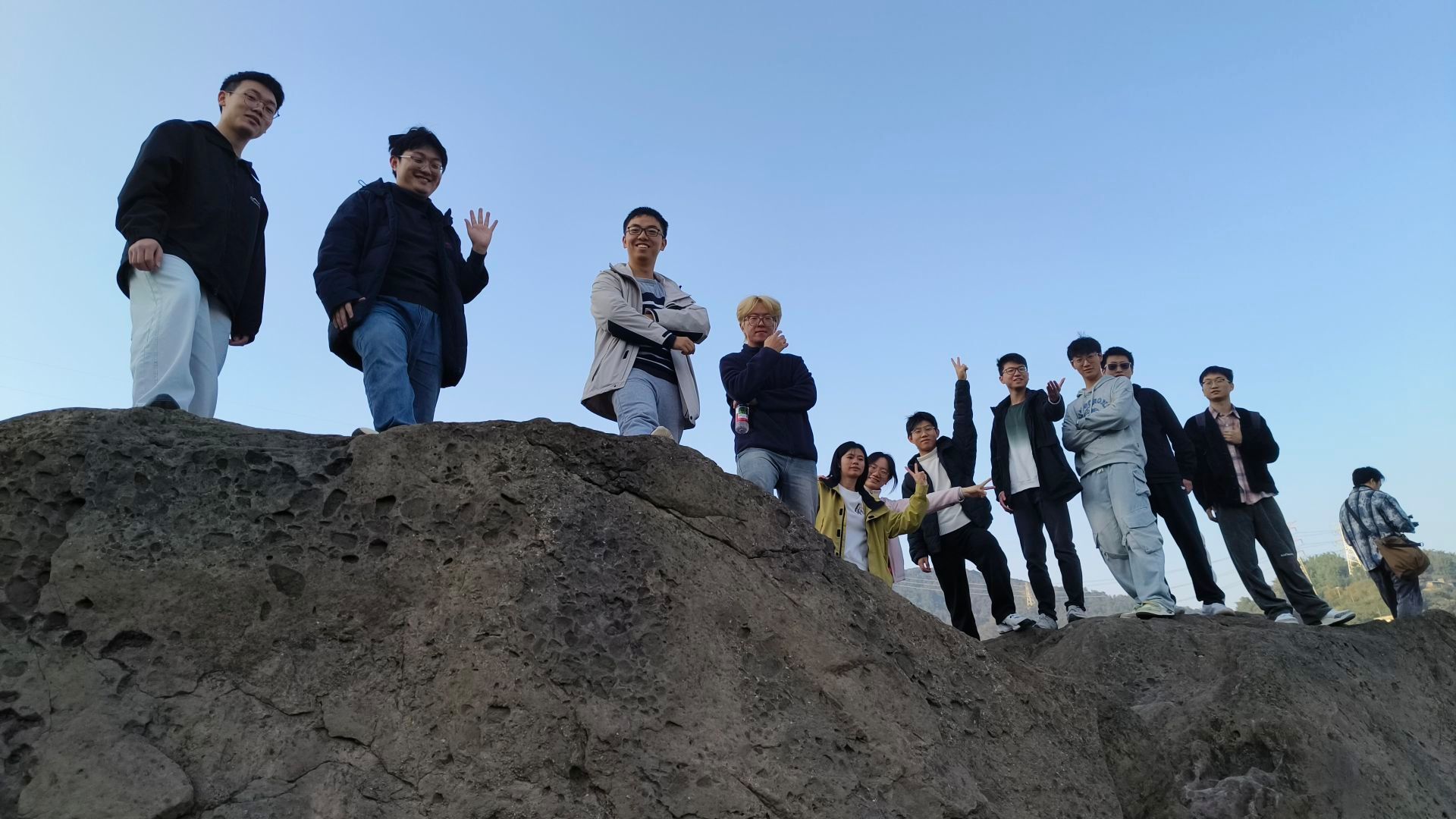 从自然的深邃历史中走出,同学们乘车前往金刚碑。这座承载着巴渝人文记忆的历史街区,青石板路、老木屋、斑驳的墙垣,处处散发着岁月的沉香。大家行走在街区的阡陌之间,触摸着老建筑的一砖一瓦,仿佛能听见昔日商贾往来的喧嚣、匠人劳作的号子。在嘉陵江边的巨石上,同学们或昂首微笑,或意气风发地比出胜利手势,将青春的活力与古镇的沧桑定格在同一片蓝天之下。