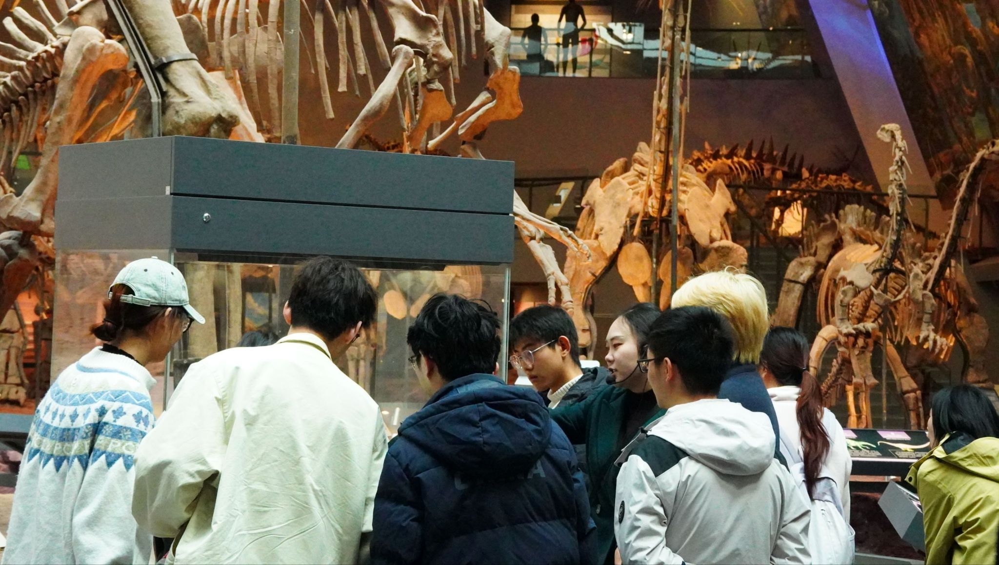 当日下午,同学们从学校启程,抵达重庆自然博物馆。这座以“自然・生命・人”为核心的场馆,瞬间将大家带入亿万年前的生命史诗。在恐龙展厅,巨型的肉食性恐龙骨架化石昂首矗立,锋利的牙齿与粗壮的骨骼仿佛仍在诉说远古时代的生存博弈;讲解员围绕恐龙化石的发掘故事、生物演化逻辑展开生动讲解,同学们或驻足观察化石的纹理细节,或围绕展品热烈讨论,在古生物的世界里叩问生命演化的奥秘。