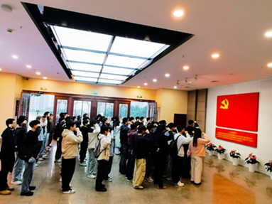 参观行至高潮,在纪念馆内那面浸染着无数革命先烈热血的党旗下,全体党员驻足肃立,举起右拳,重温入党誓词。“我志愿加入中国共产党……”一句句铿锵誓言,仿佛与历史深处的革命回响交织共鸣,是对初心使命的再次叩问,也是对新时代责任的庄严应答。在这庄严的时刻,大家立下了“以吾辈之青春,捍卫盛世之中华”的壮志,誓要将红岩精神熔铸于血脉,以科技报国的实际行动,续写新时代的红色华章。