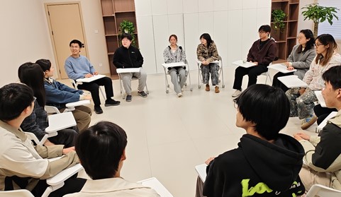 本次活动在孟雁鹏老师的引导下有序进行。活动伊始,通过轻松有趣的“雨点变奏曲”互动游戏,有效调动了现场氛围,帮助同学们迅速集中注意力,缓解紧张情绪。随后,全体同学被分为三个小组,每组5人,围绕个人基本信息展开交流,包括姓名、年龄、星座及家乡等内容,使彼此有了初步了解。