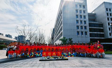 随着高亢激昂的运动员进行曲回荡在田径场上空,学院方阵迈着铿锵整齐的步伐,精神抖擞地走进赛场。该方阵由70余名学生组成,由学生自主设计、制作的电路板模型,生动彰显出学院深耕微电子与通信领域、勇担科技报国使命的坚定决心。当方阵行至主席台前,学子们快速变换出规整有序的队形,伴随着“通梦启航,信铸辉煌;腾蛟起凤,飞志凌云”的横幅展示和铿锵口号,“通信腾飞”的字板高高举起,手中黄蓝花球和彩色花环同步挥舞,勾勒出灵动的光韵,瞬间将现场氛围推向顶峰。这份独具巧思的编排赢得了全场师生的热烈掌声,既彰显了通信学子“以科技赋能青春 以拼搏书写担当”的精神风貌,又展现出学院深耕体育育人、助力学生全面发展的实际举措,取得了良好的反响与效果。